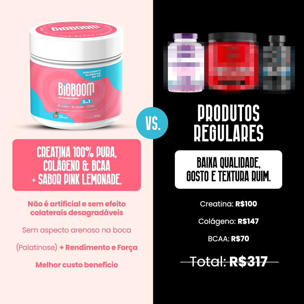 A diferença da Big Boom é o resultado que você vai ter suplementando 3 suplementos em apenas 1 com o melhor custo X benefício do mercado.